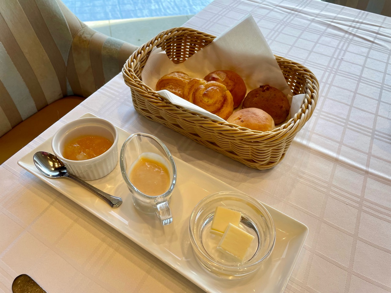 5種類のプチパン入りバスケットがサーブされます。 敷地内にあるベーカリーのもの。 真ん中はミルクジャム。