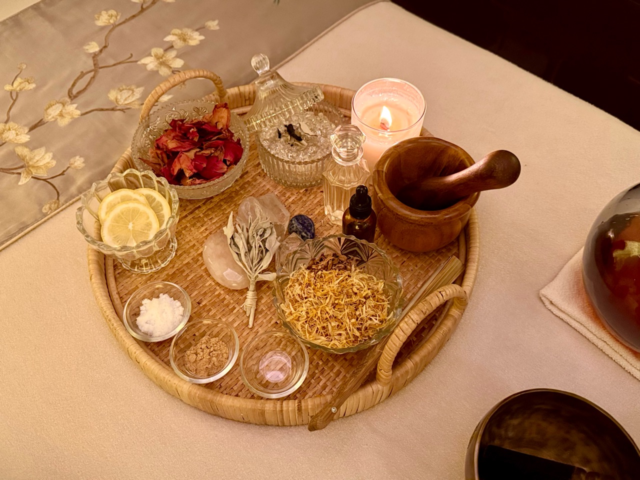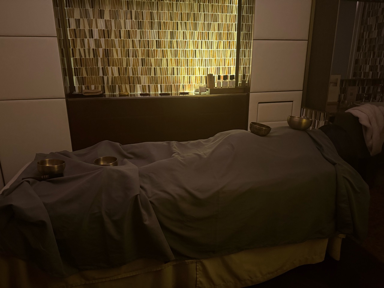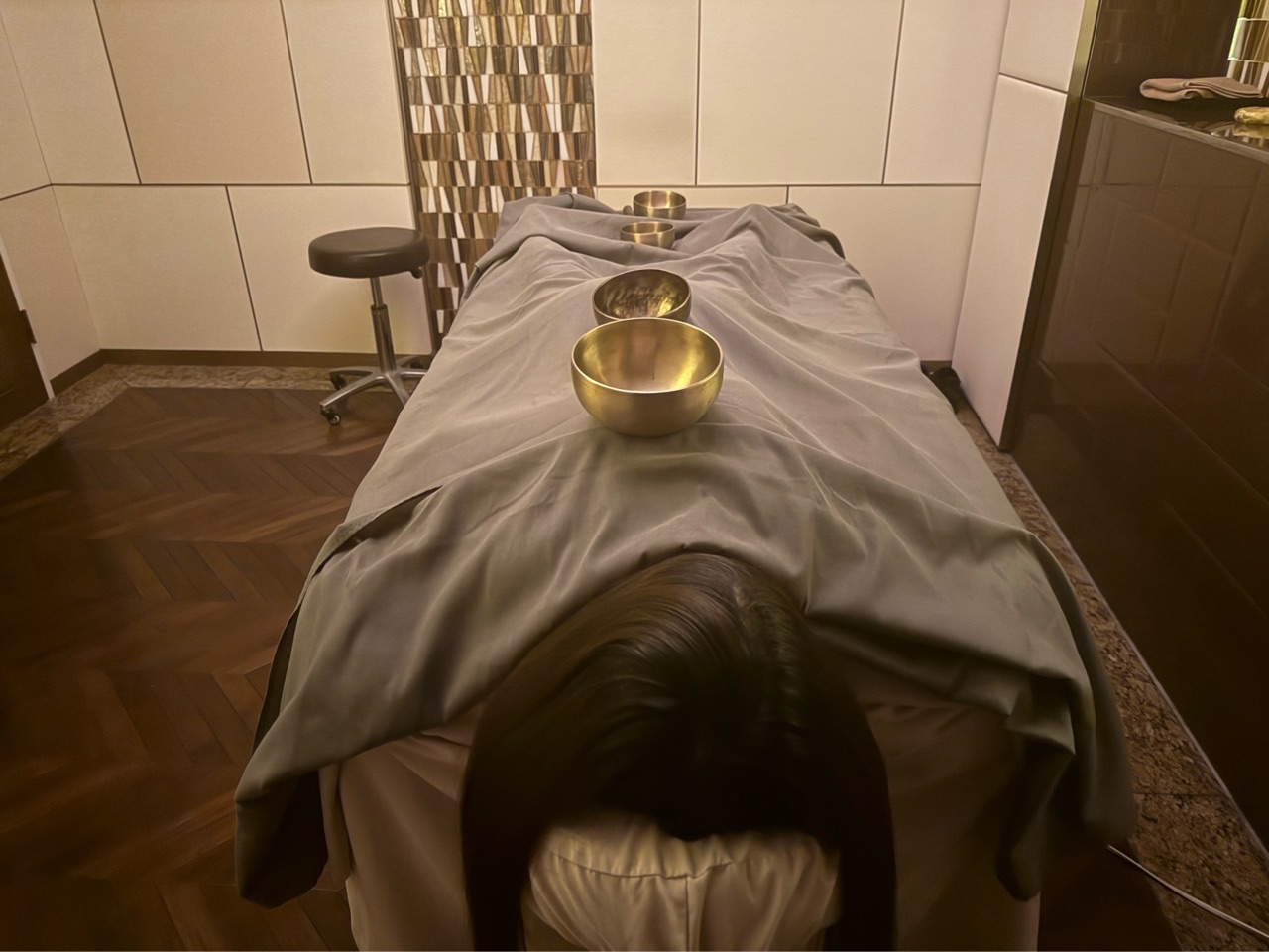 画像のような感じで、身体の上にシンギングボウルが置かれています。 わぁ、、こんな儀式があるのですね。さすが、常に進化を続けるスパです。
