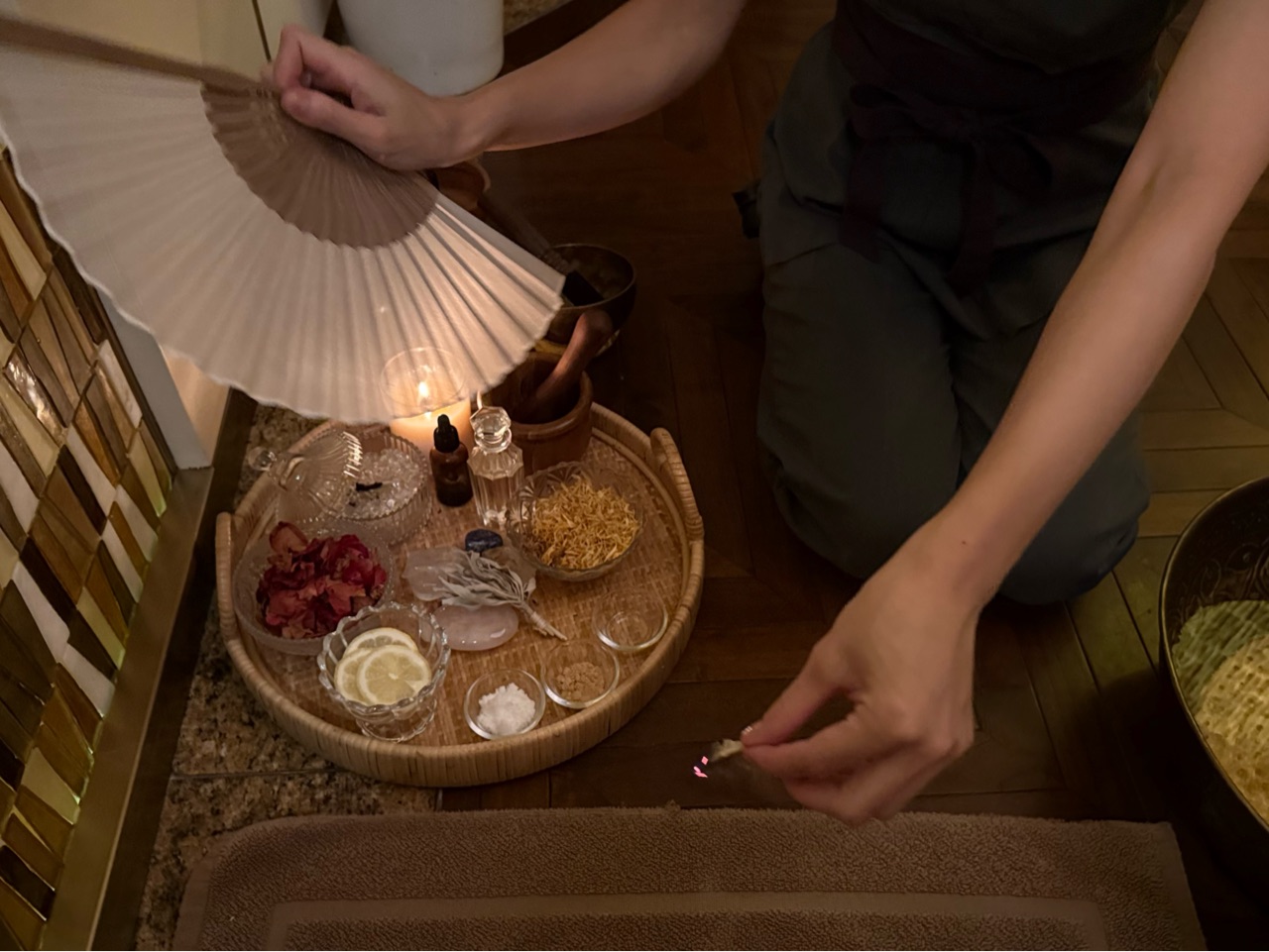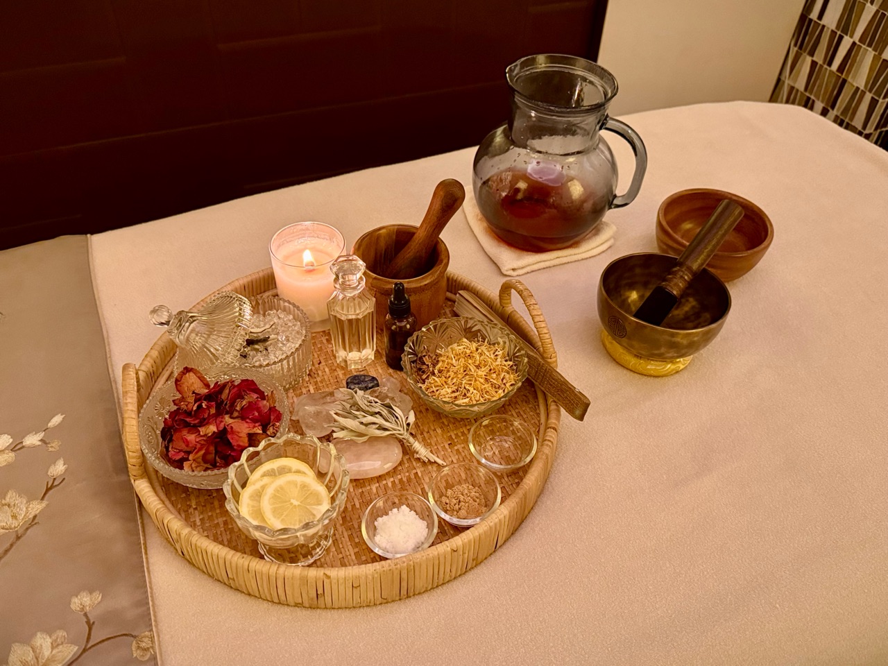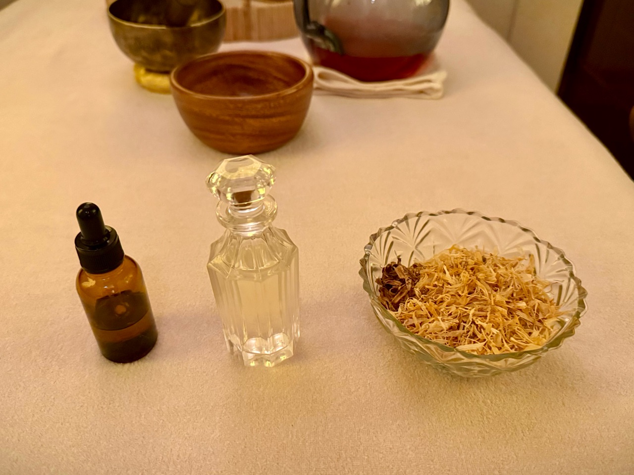 丁寧なフットバスが終わり、いよいよベッドへ。 オイルトリートメントの前には、もうひとつの儀式があります。