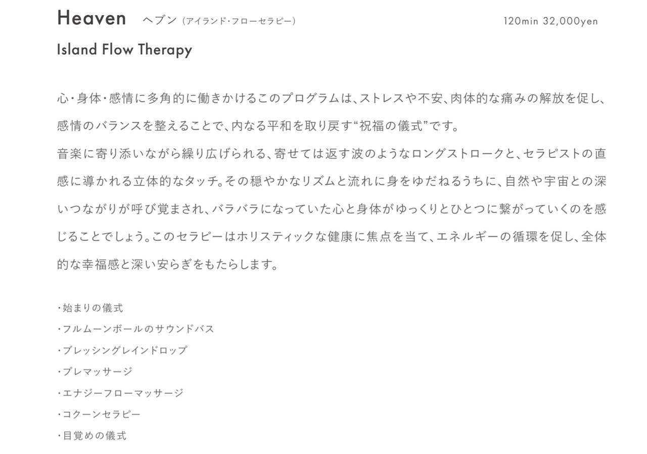 今回は、今年の夏にスタートしたという新プログラム「Heaven (ヘブン)」を体験させていただきました。久々に、ボディのみのトリートメントです。