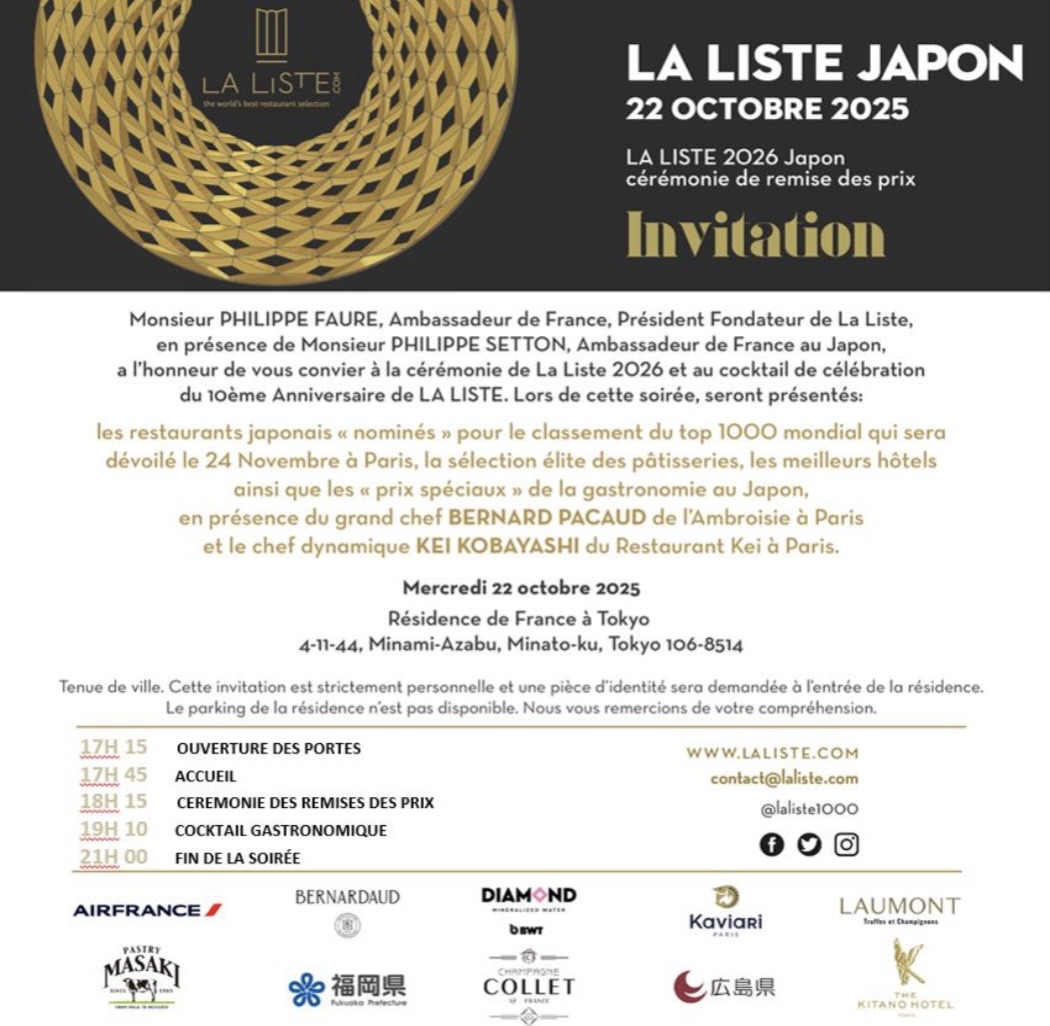 今年は、設立10周年を迎えられるとのこと。併せて、今月に正式発表される「La Liste 2026」を記念し、日本でノミネートされた方々や特別賞の授賞式を行う記念レセプションが、フランス大使公邸にて開催されました。